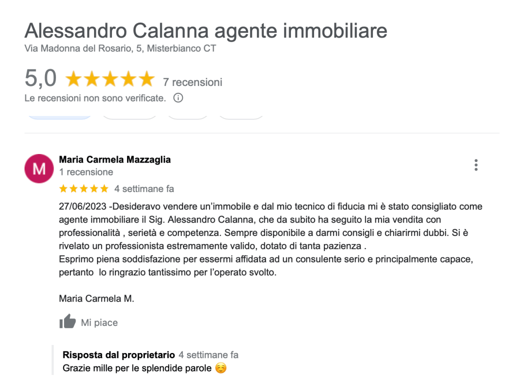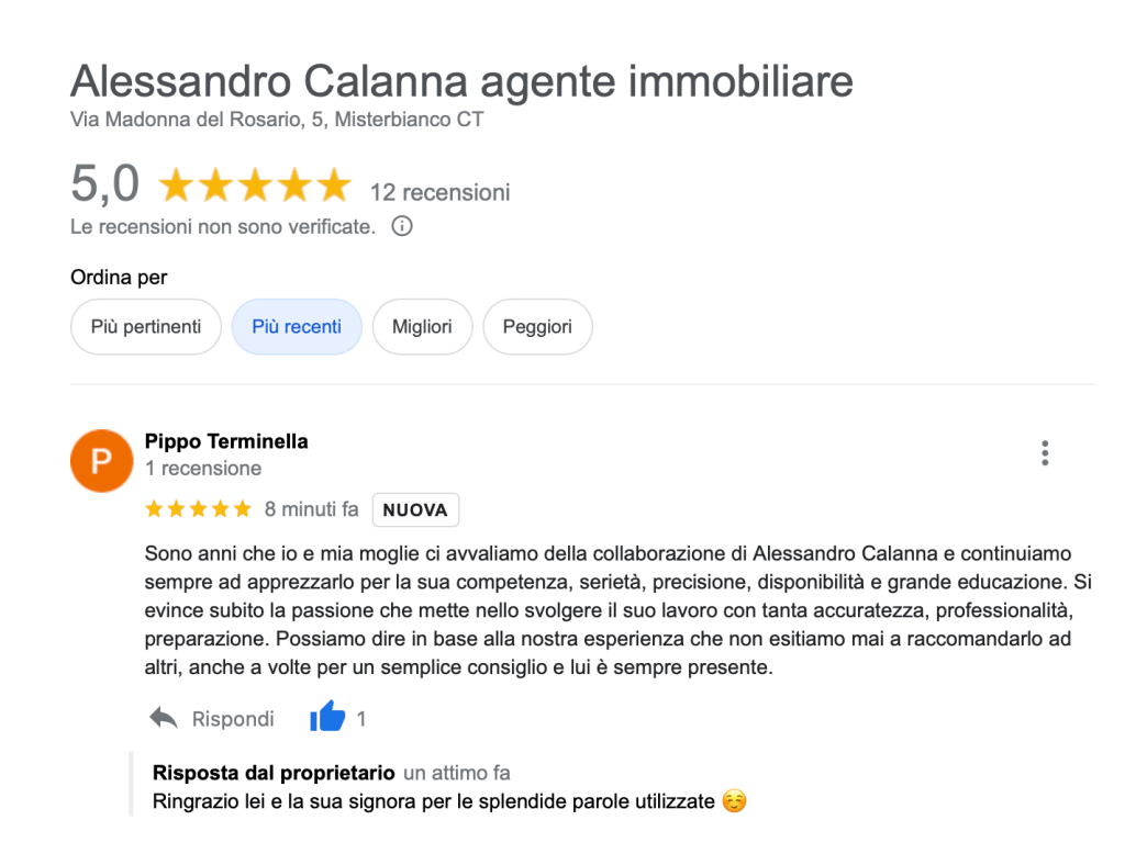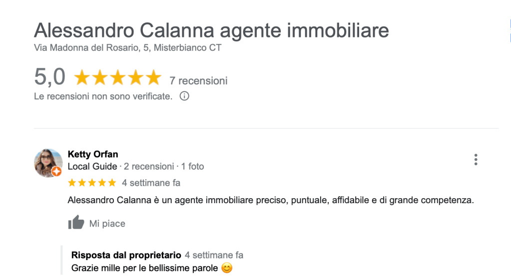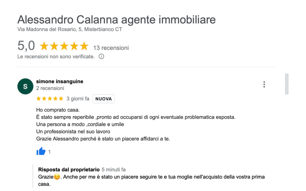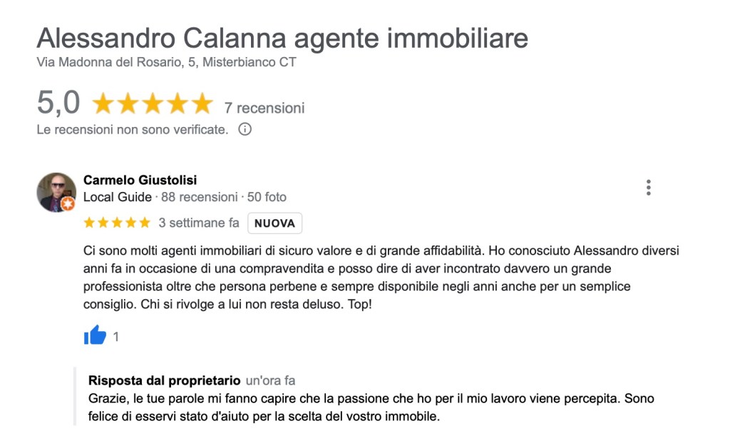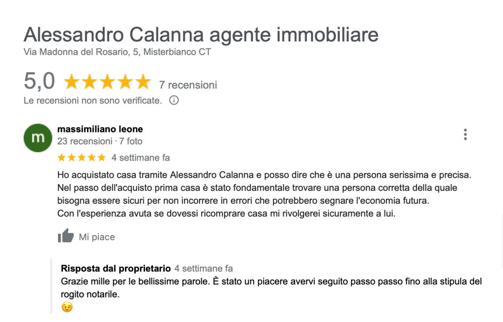 Se mi hai conosciuto per una semplice consulenza immobiliare o, meglio ancora, perché hai comprato, venduto o affittato un qualsiasi immobile, ti chiedo di lasciare una opinione su come ho svolto il mio lavoro.